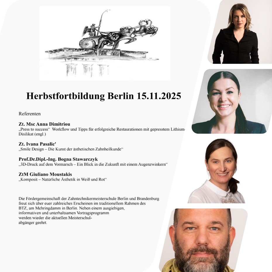 Auch in diesem Jahr lädt die Fördergemeinschaft der Meisterschule für Zahntechnik in Berlin-Brandenburg e. V. wieder zu ihrer Herbstfortbildung ein. Die Veranstaltung am 15.11.2025 richtet sich thematisch natürlich an Vertreter der zahntechnischen Zunft, aber auch an zahnmedizinische Behandler und alle Interessierten. Als Eventlocation fungiert erneut der große Saal des Bildungs- und Technologiezentrums der Handwerkskammer am Mehringdamm.